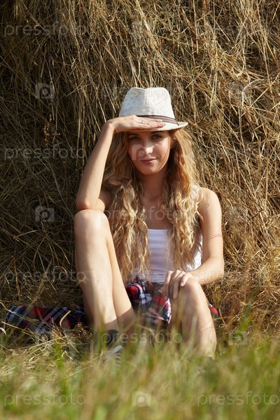 Молодая белокурая деревенская девушка в шляпе возле стога сена