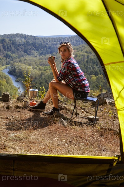 Молодая блондинка-туристка в лагере на скале над речным и лесным ландшафтом