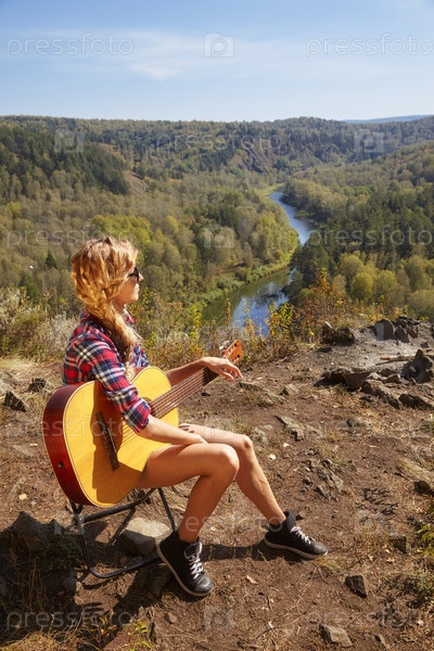 Молодая блондинка-туристка с гитарой на скале над речным и лесным ландшафтом