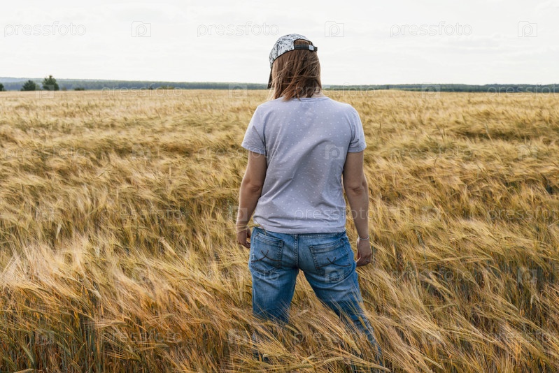 Вид сзади женщина в джинсах среди желтых сухих злаков пшеничное поле сельское хозяйство и урожай зерна макет дружелюбный