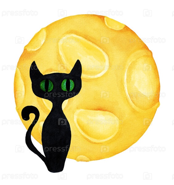 Хэллоуин. Черный кот с зелеными глазами и луной. Акварель