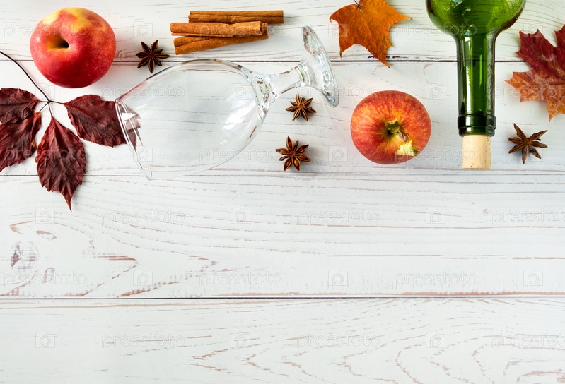 Спелые свежие сочные красные яблоки, специи, бутылка и стакан для сидра на светлой деревянной поверхности