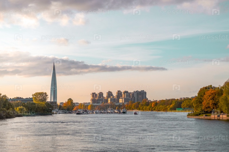 Вид на небоскреб Лахта Центр и парк на Елагином острове через реку Средняя Невка