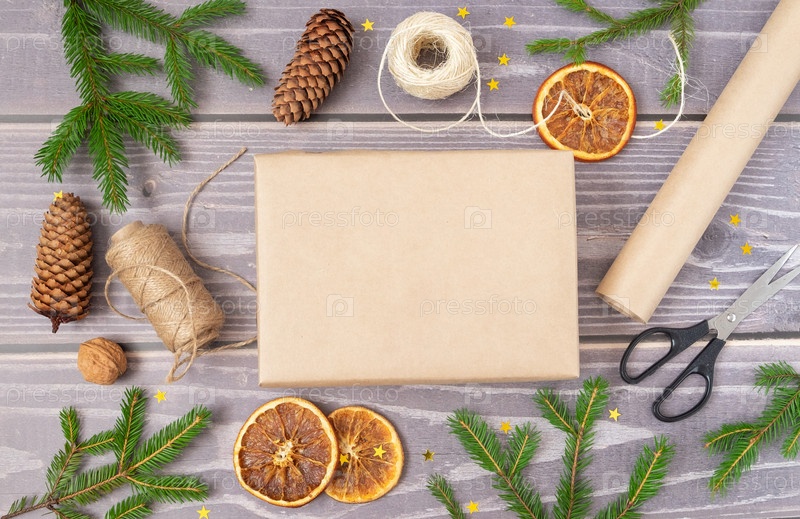 Крупный план упаковки рождественского подарка. Рождественский декор и перерабатываемые упаковочные материалы