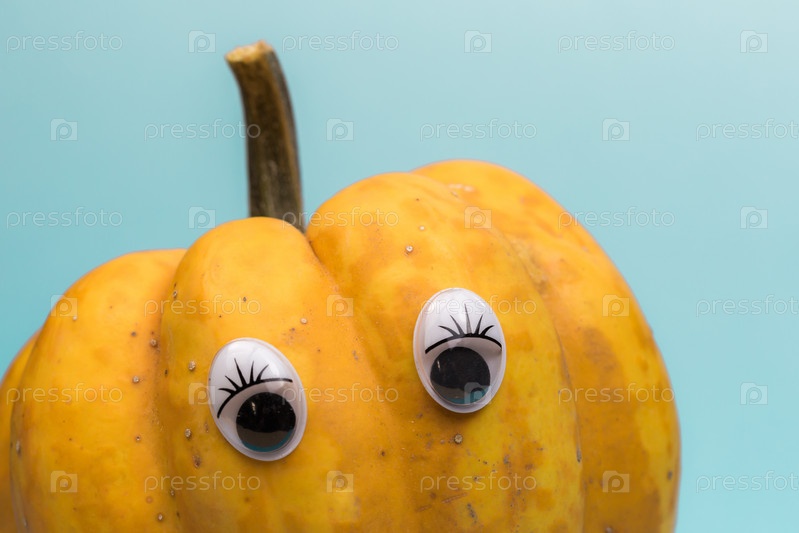 Забавная перезрелая тыква с глазами на голубом фоне