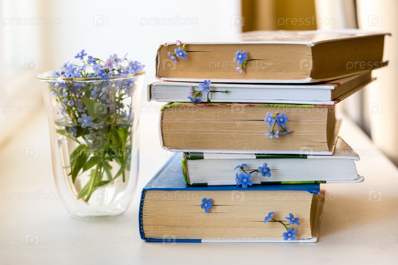 Стопка книг с маленькими голубыми цветами между страницами на белом столе