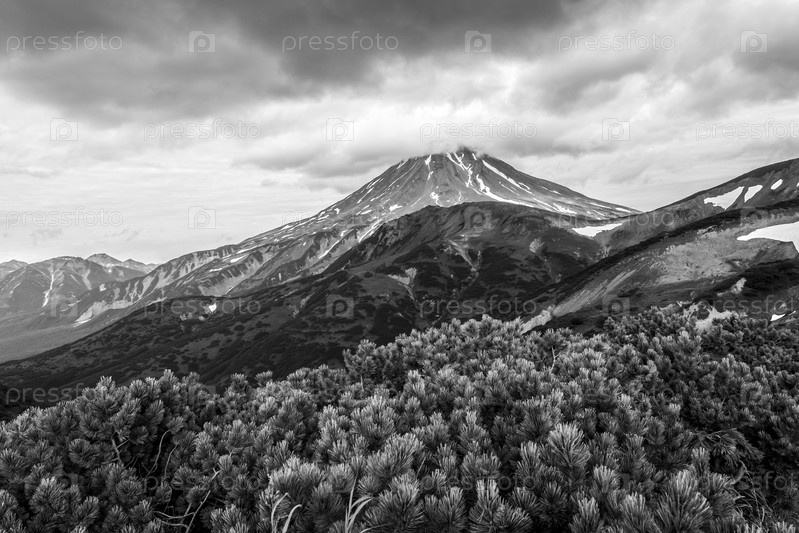 Вид на вулкан Вилючинский в пасмурную погоду, полуостров Камчатка, Россия
