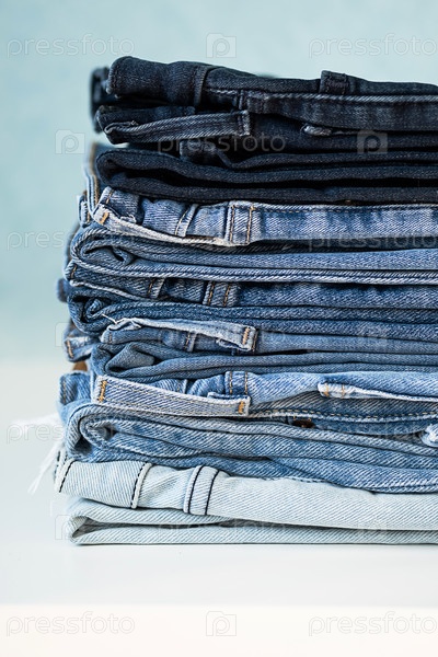 Несколько сложенных синих джинсов, крупным планом. Джинсовая коллекция
