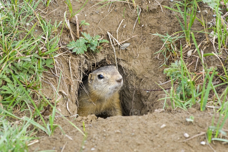 Любопытный лисица (Spermophilus undulatus) выглядит из норы Долина реки Чуя, Алтай