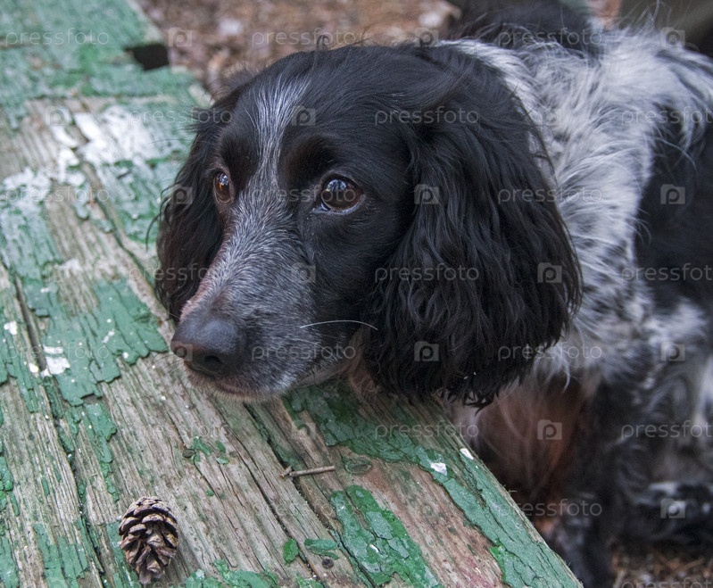 Портрет грустного черно-серого русского охотничьего спаниеля