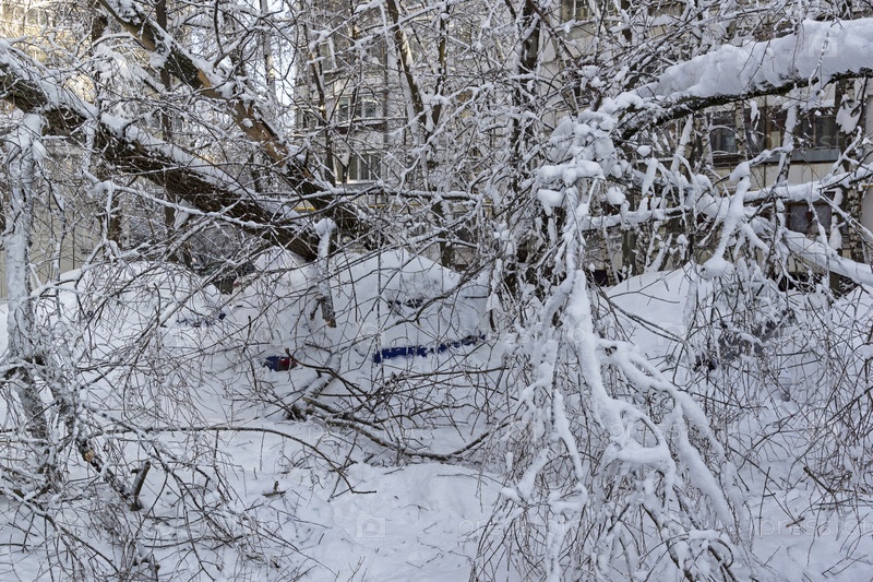 Снежная зима 2017-2018 годов в Москве. Упавшее в результате сильного снегопда дерево придавило припаркованные во дворе дома машины