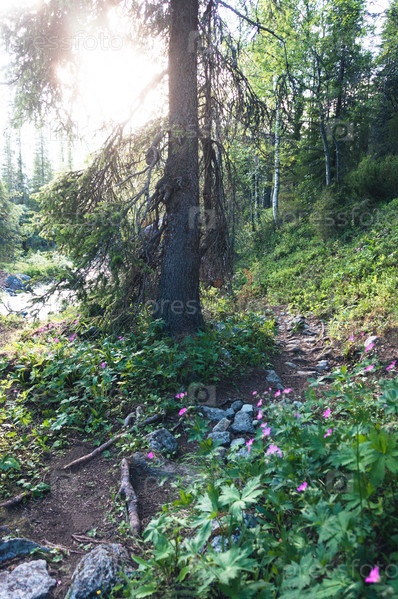 Тропа в лесу в лучах солнца