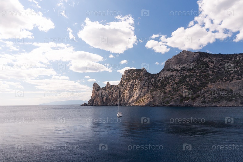 Скала в море. Белая яхта в море. Пейзаж Крыма
