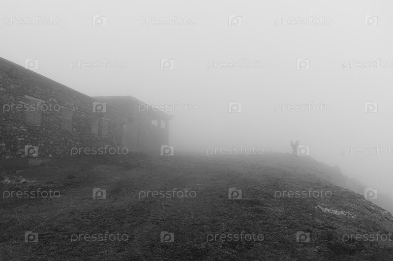 Двое людей возле заброшенного строения в тумане