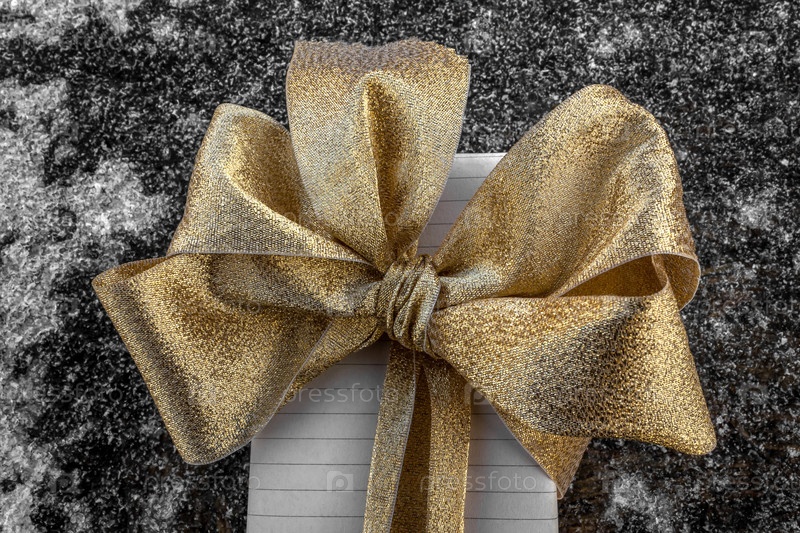 Золотой бант, украшающий праздничную коробку с подарком крупным планом