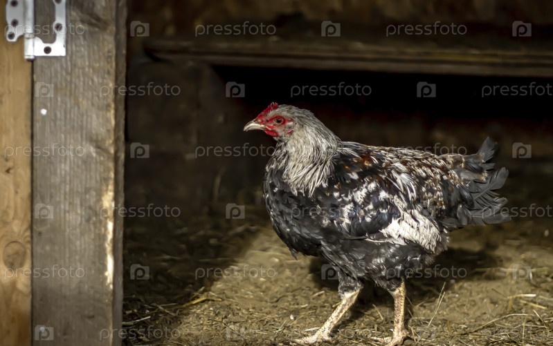 Рябая курица внутри сарая. Разведение кур и несушек