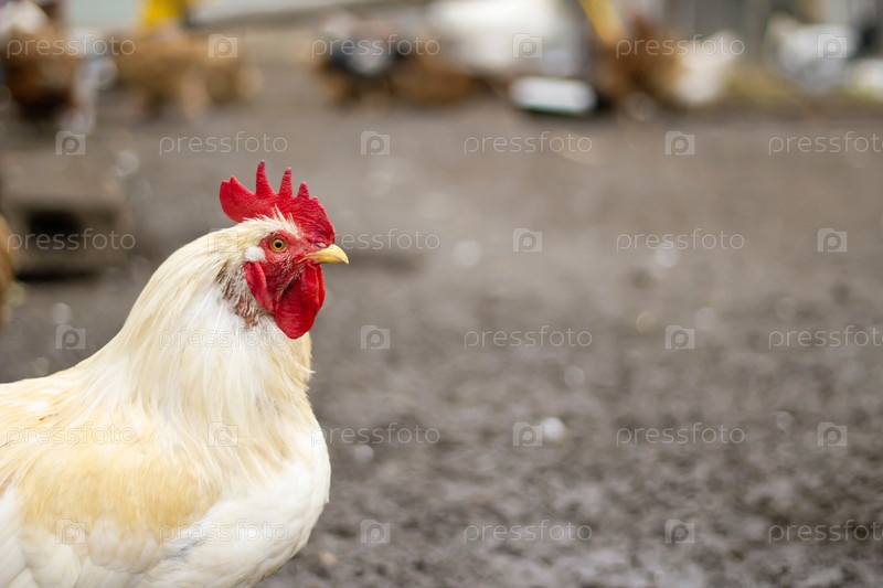 Белый петух на прогулке в курятнике