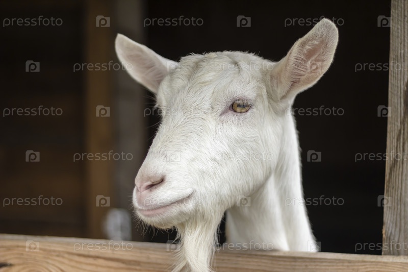 Портрет белой комолой козы Зааненской породы, домашняя ферма, Россия