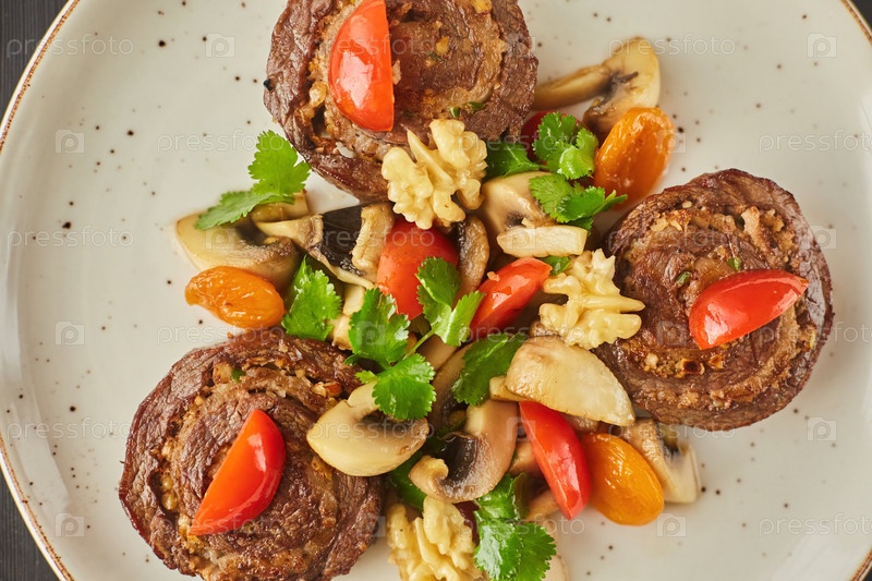 Рулет из свинины, баранины или говядины с грибами, орехами, помидорами и зеленью. Блюдо от шеф-повара