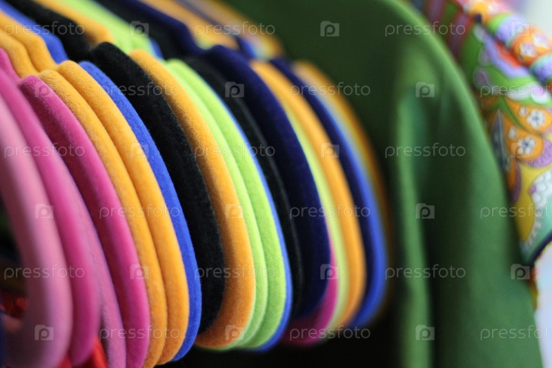 Разноцветные вешалки для одежды на кронштейне, атмосфера модного бутика и ателье