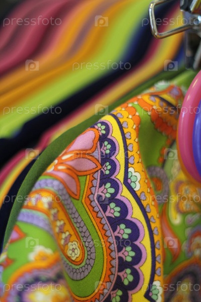Деталь разноцветной одежды с вешалками на кронштейне