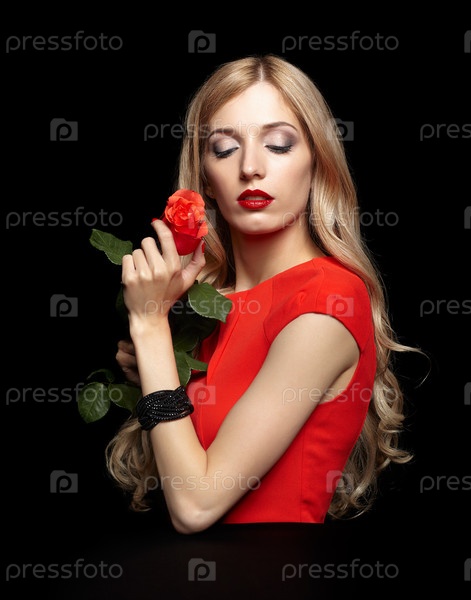 Портрет молодой красивой блондинки в красном платье с красной розой в руках на черном
