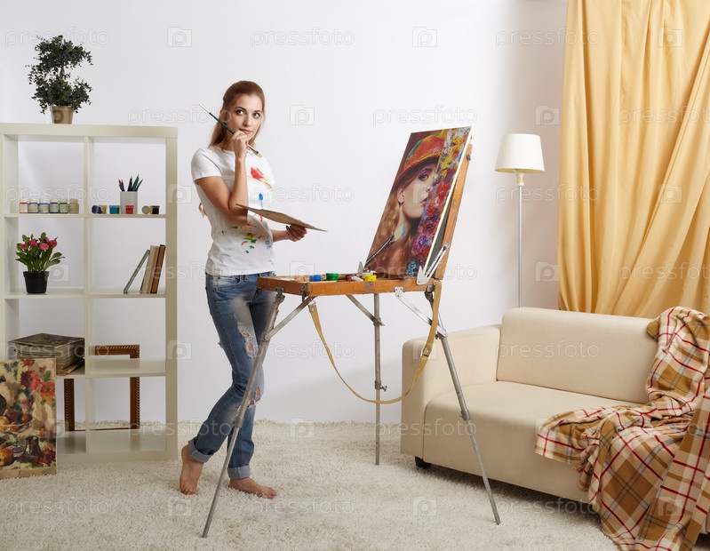 Художница с деревянным альбомом для рисования и портретом