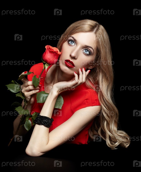 Портрет молодой красивой блондинки в красном платье с красной розой в руках на черном