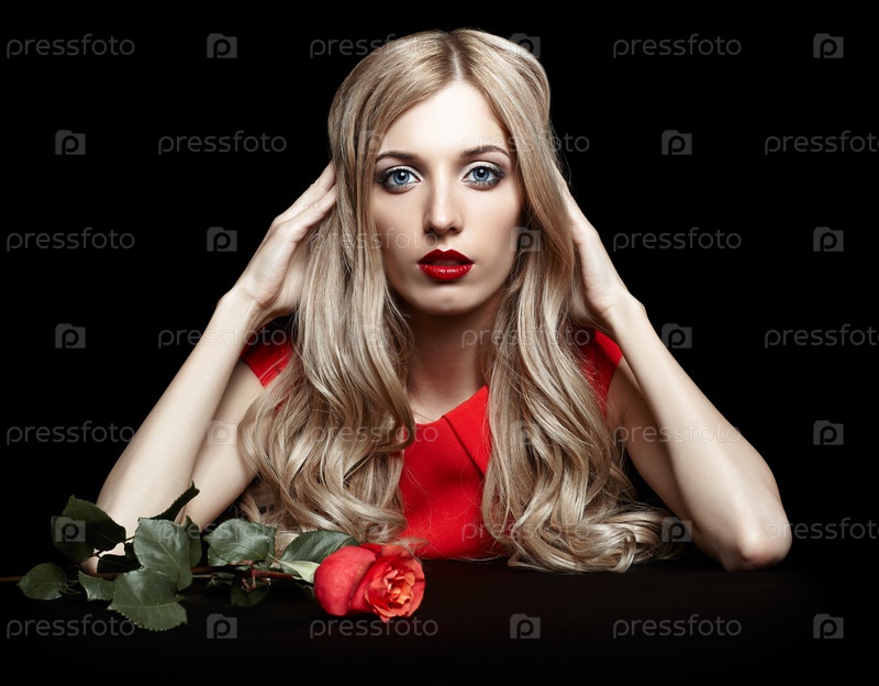 Портрет молодой красивой блондинки в красном платье с красной розой в руках на черном