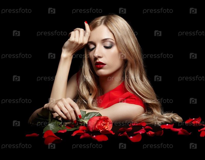 Портрет молодой красивой блондинки в красном платье с красной розой в руках на черном