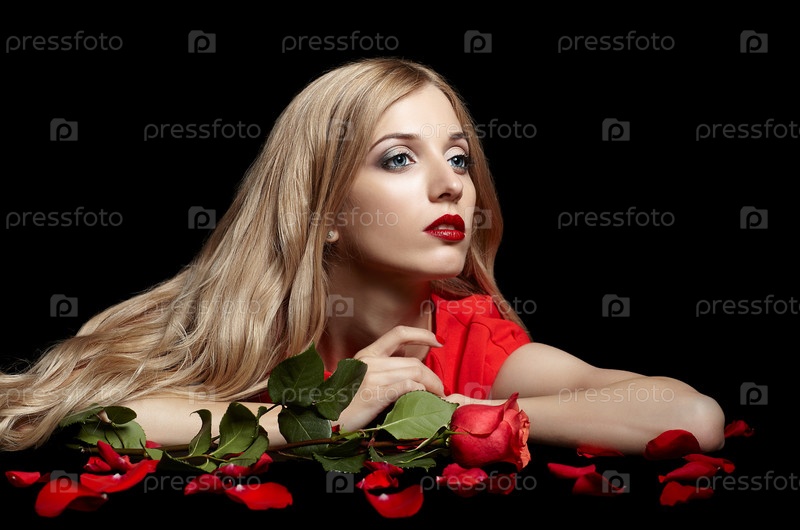 Портрет молодой красивой блондинки в красном платье с красной розой в руках на черном