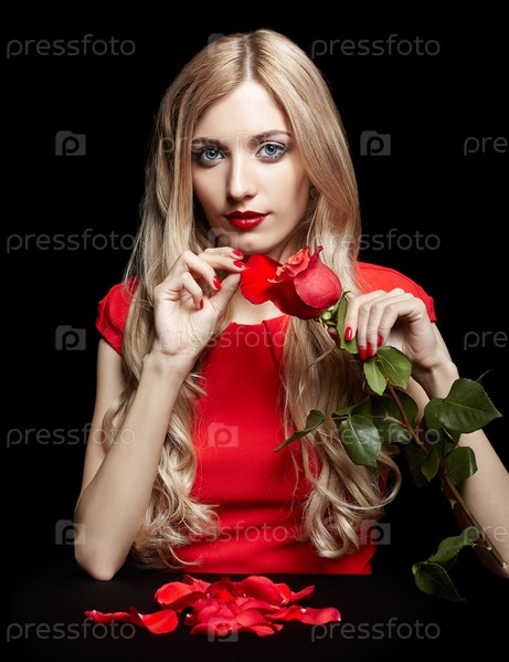 Портрет молодой красивой блондинки в красном платье с красной розой в руках на черном