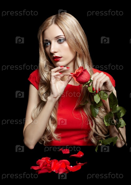 Портрет молодой красивой блондинки в красном платье с красной розой в руках на черном