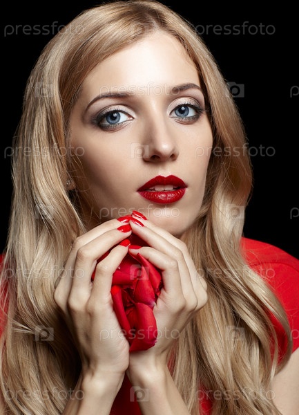 Портрет молодой красивой блондинки в красном платье с красной розой в руках на черном
