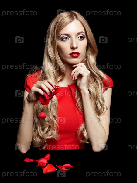 Портрет молодой красивой блондинки в красном платье с красной розой в руках на черном