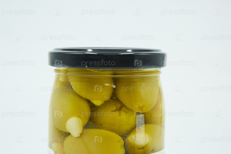 Консервированные зеленые оливки в стеклянной банке. Домашнее консервирование