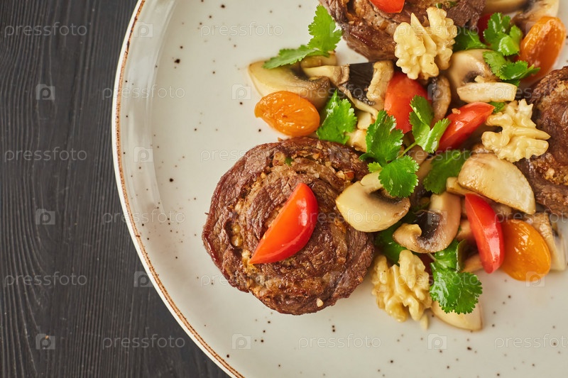 Рулет из свинины, баранины или говядины с грибами, орехами, помидорами и зеленью. Блюдо от шеф-повара