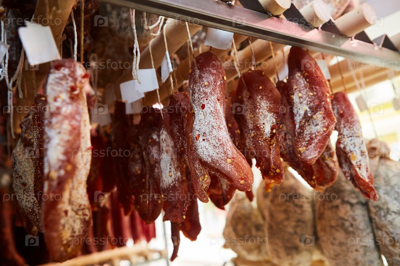 Линия по производству колбасных изделий. Колбаса висит на прилавке магазина. Мясные продукты
