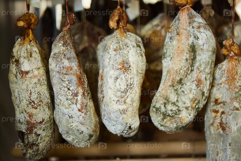 Линия по производству колбасных изделий. Колбаса висит на прилавке магазина. Мясные продукты