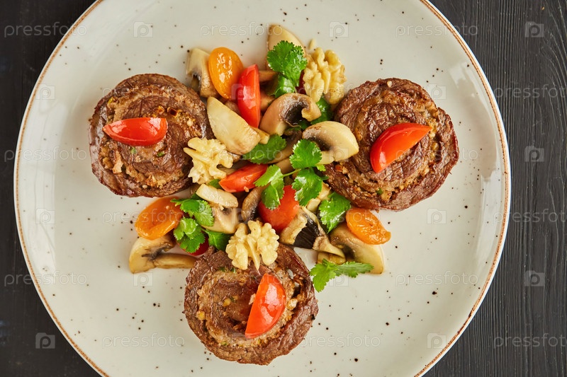 Рулет из свинины, баранины или говядины с грибами, орехами, помидорами и зеленью. Блюдо от шеф-повара