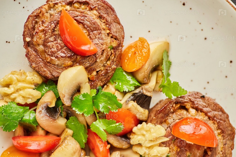 Рулет из свинины, баранины или говядины с грибами, орехами, помидорами и зеленью. Блюдо от шеф-повара