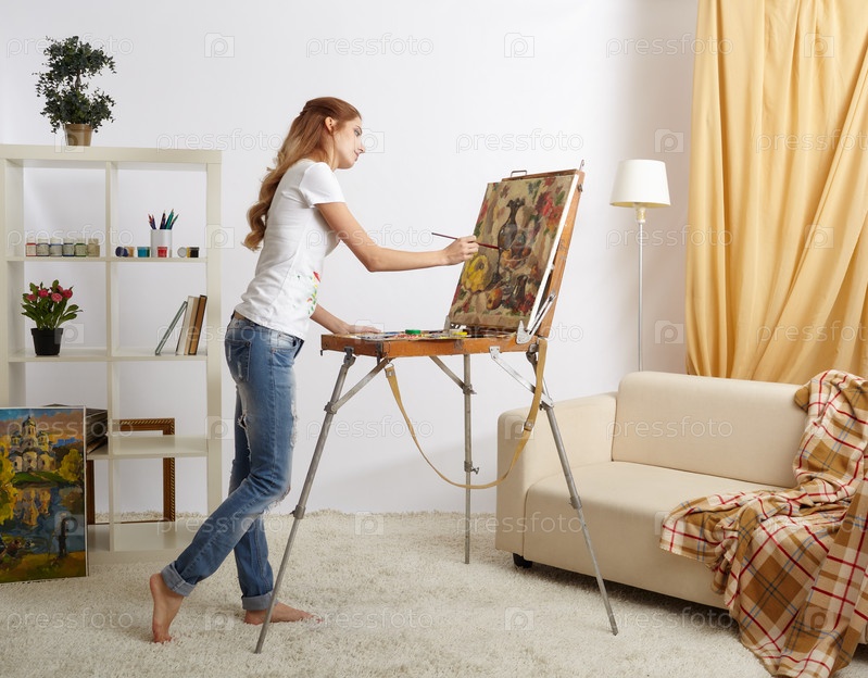 Художница с деревянным альбомом для рисования и живописью