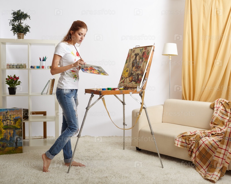 Художница с деревянным альбомом для рисования и живописью