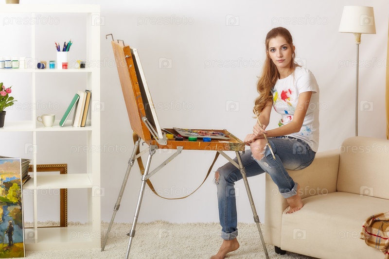 Художница с деревянным альбомом сидит на диване и рисует