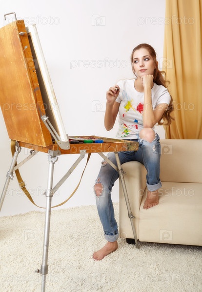 Художница с деревянным альбомом сидит на диване и рисует