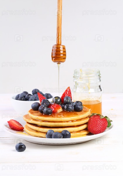 Натюрморт с панкейками , ягодами и медом на белом фоне
