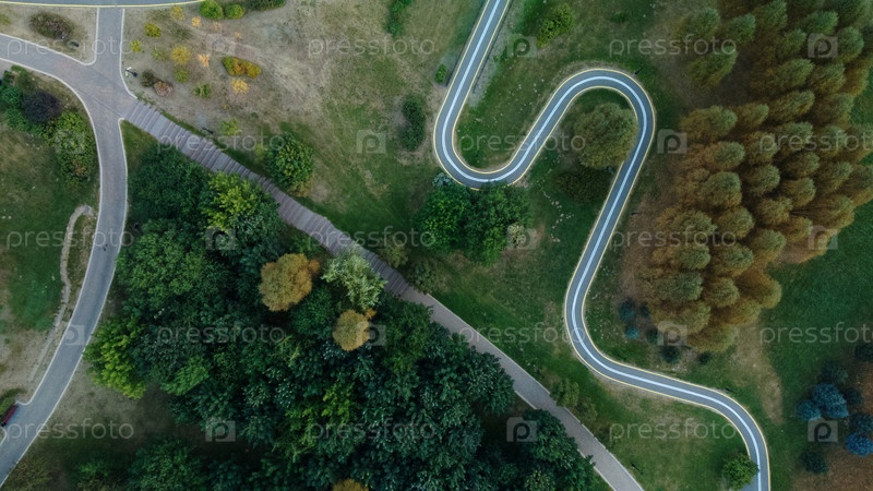 Велосипедная дорожка в городском парке. Городской парк на рассвете. Аэрофотосъемка