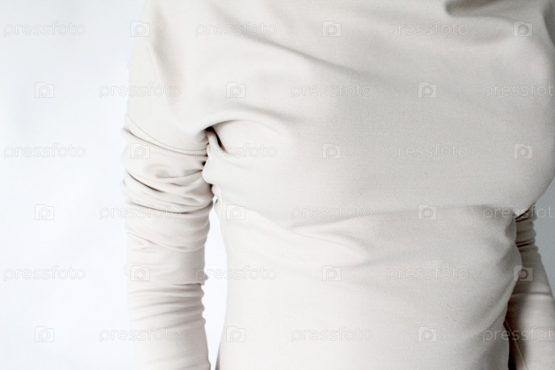 Платье из джерси с драпированным рукавом крупным планом, ракурс снят спереди на уровни груди