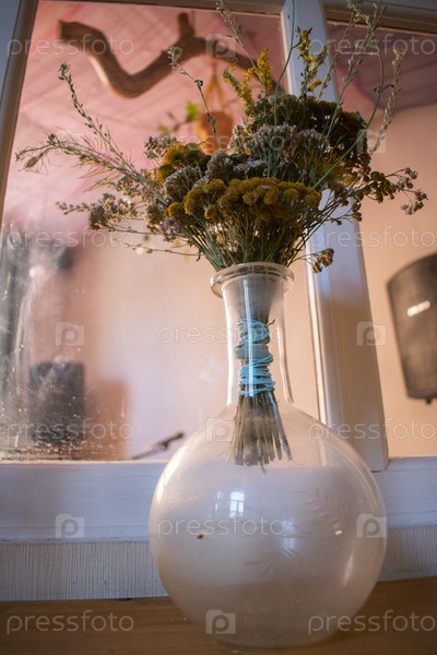 Букет сухоцветов, перевязанный синей нитью и стоящий в стеклянной прозрачной вазе у окна в комнату и солнечный свет из окон этой комнаты и горшки с растениями, висящие в ней на палочке
