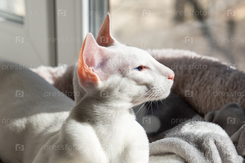 Ориентальная короткошерстная белая кошка лежит у окна